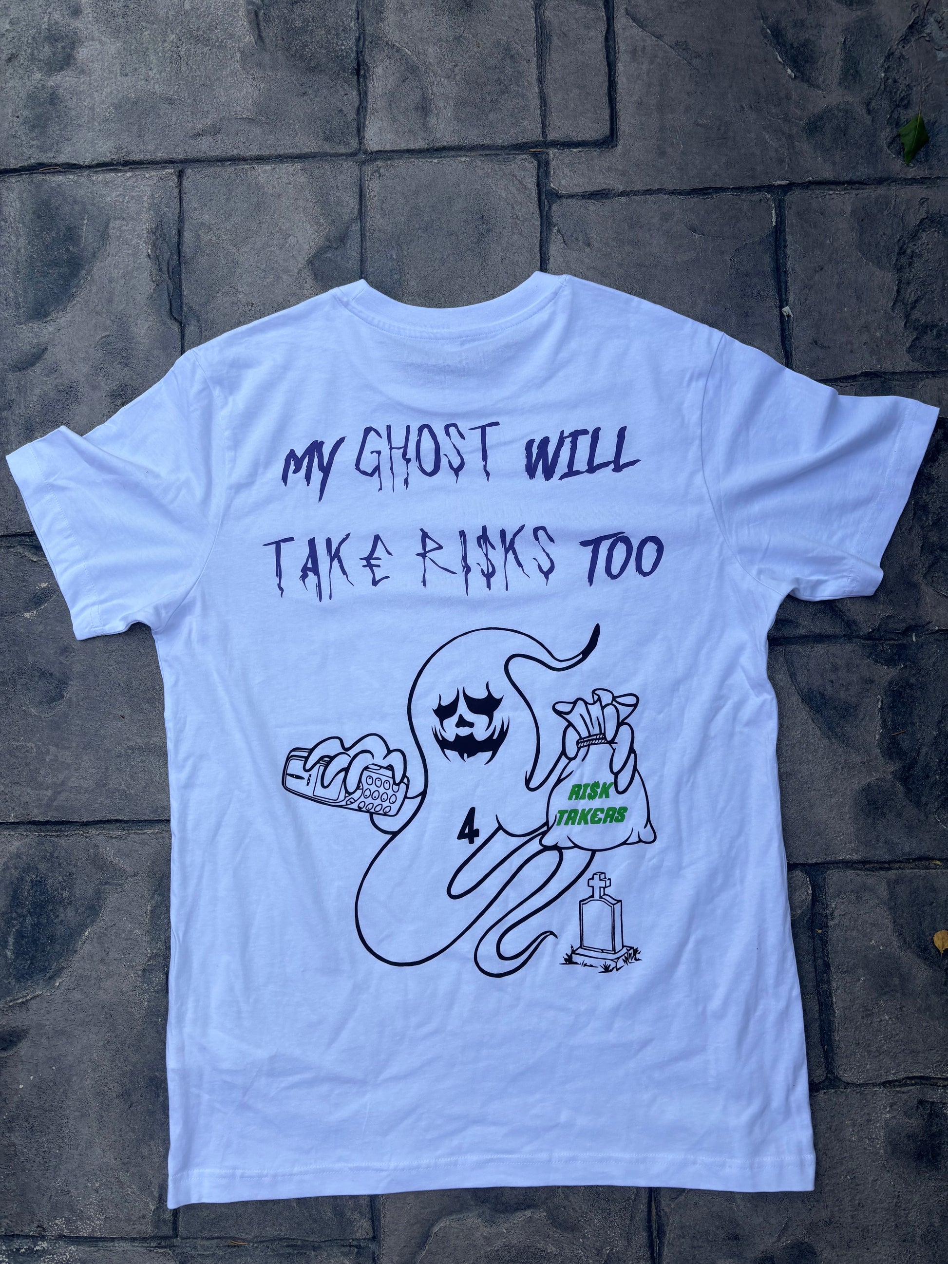 Бял t-shirt "MY GHOST WILL TAKE RI$KS TOO" by RI$K TAK€RS x PRIZRAK